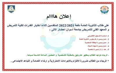 علي طلاب الثانوية العامة دفعة 2022/2021 المتقدمين  لأداء اِختبار القدرات لكلية التمريض والمعهد الفني للتمريض جامعة أسوان احضار الاتي  استمارة…