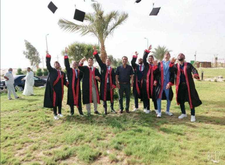 طلاب تخرج كلية العلوم يلتقطون الصور التذكارية أمام الحرم الجامعي بصحاري