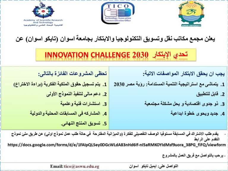 يعلن مجمع مكاتب نقل وتسويق التكنولوجيا والإبتكار بجامعة أسوان عن تحدى الإبتكار(2030) Innovation  challenge  يجب أن يحقق الإبتكار المواصفات الاتية…